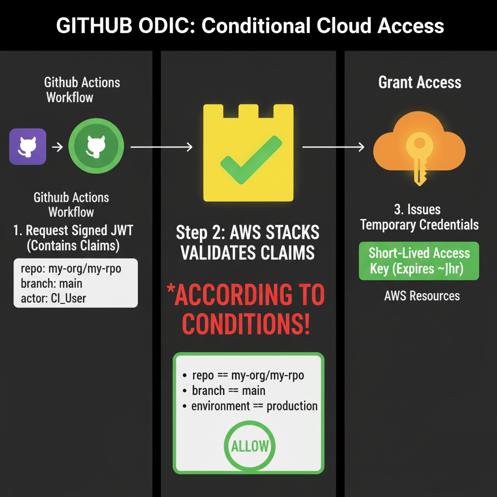 // AWS Trust Policy "Statement": [{ ... "Principal": { "Federated": "<arn:aws:iam::123:oidc-provider/token.actions.githubusercontent.com>" }, "Action": "sts:AssumeRoleWithWebIdentity", "Condition": { "StringEquals": { "token.actions.githubusercontent.com:sub": "repo:my-org/my-repo:more-conditions"], "token.actions.githubusercontent.com:aud": "sts.amazonaws.com" ...